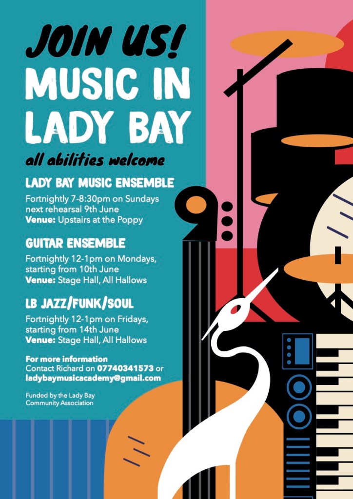 - Lady Bay Jazz Collective : rehearsals fortnightly on Fridays 12-1:30pm at the Stage Hall, All Hallows